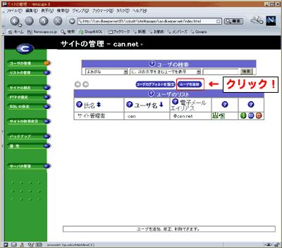 ログイン後、最初の画面で、「ユーザーを追加」ボタンをクリックします。 |
