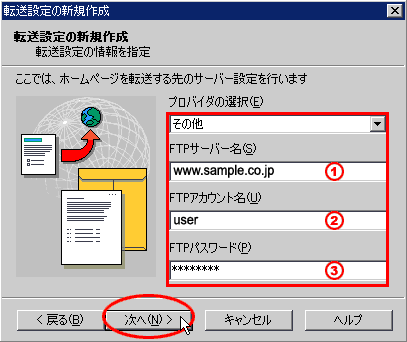 1. 「転送先のサーバー名」→ 初期設定のご案内の「FTPサーバ名(ホスト名)」 例)www..sample.co.jp