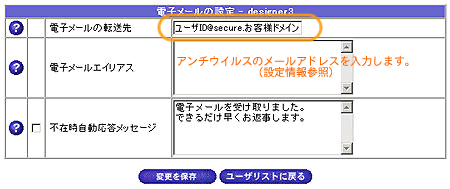 「電子メールの設定」内の「電子メールの転送先」にアンチウイルスのメールアドレス1つを入力します。