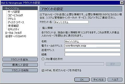 「アカウントウィザード」の「新規アカウント設定」ウィンドウが開きます。